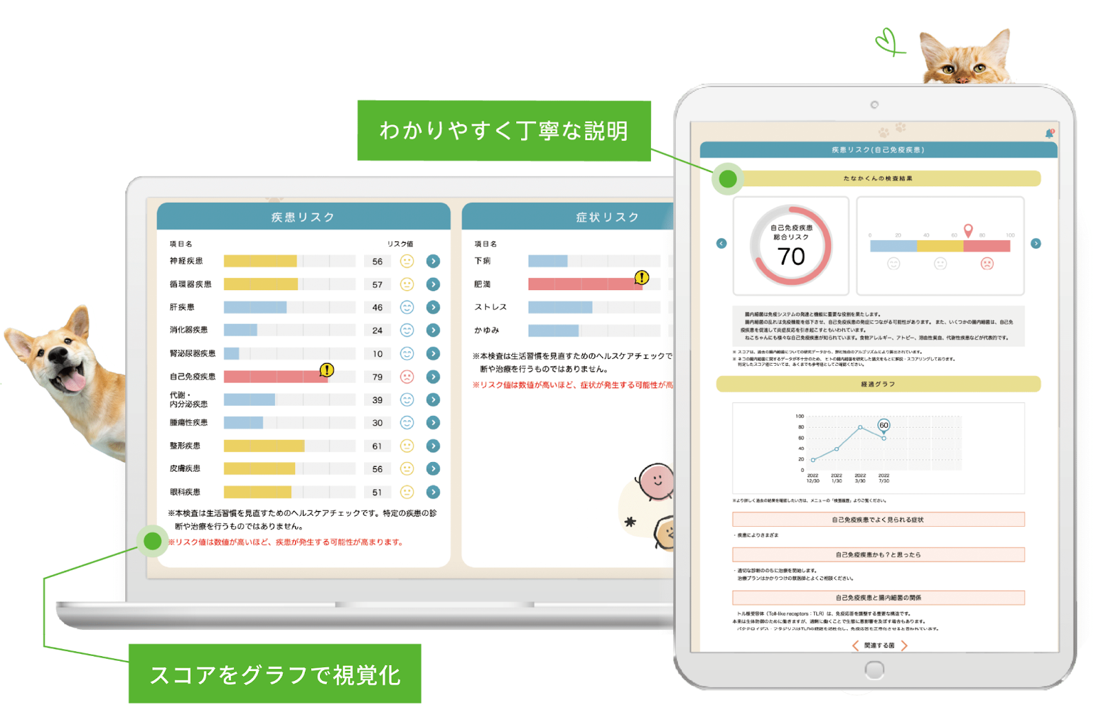 PitPETは健康状態を表すスコアがグラフ化されるため、視覚的にわかりやすく腸内環境を把握できます。疾患29項目、症状6項目のリスクがわかるほか、おすすめの食材なども提案してくれます。