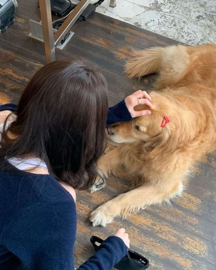 上からのアングルで、寝そべっているワンちゃんをよしよし。画面から愛情がたくさん感じられる、あたたかみのある構図です。