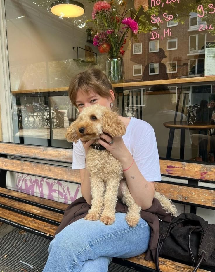 お洒落なカフェのベンチでオススメのポーズ。ちょこんと乗っている感じが可愛い!